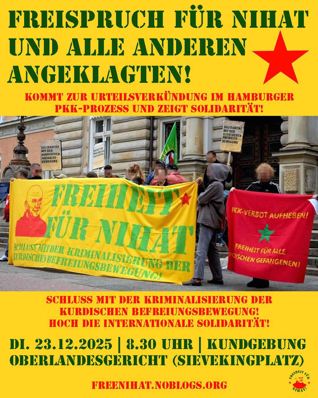 Noch in diesem Jahr, am 23. Dezember 2025, soll im Hamburger PKK-Prozess gegen unseren Genossen Nihat Asut aus Kiel und einen weiteren Angeklagten aus Lübeck vor dem Oberlandesgericht (OLG) das Urteil gesprochen werden. Nach wie vor muss mit Verurteilungen wegen angeblicher „führender Mitgliedschaft in einer terroristischen Vereinigung“ gerechnet werden. Gemeint ist die sozialistische Arbeiterpartei Kurdistans (PKK). Wieder einmal wollen die deutschen Repressionsbehörden den Kampf gegen die Unterdrückung der Kurd:innen, für die Demokratisierung der Türkei und für internationale Solidarität, an dem sich die beiden Angeklagten ihr Leben lang beteiligt haben, bestrafen und greifen damit gezielt politische Strukturen der kurdischen Befreiungsbewegung an. Wie schon zur Eröffnung des Prozesses rufen wir deshalb auch am Tag der Urteilsverkündung zu einer Kundgebung vor dem OLG Hamburg auf und fordern das einzig hinnehmbare Urteil in diesem Prozess: Freispruch für beide Angeklagten, Rückgabe aller beschlagnahmten Gelder, Begleichung aller bei den Razzien entstanden Schäden!