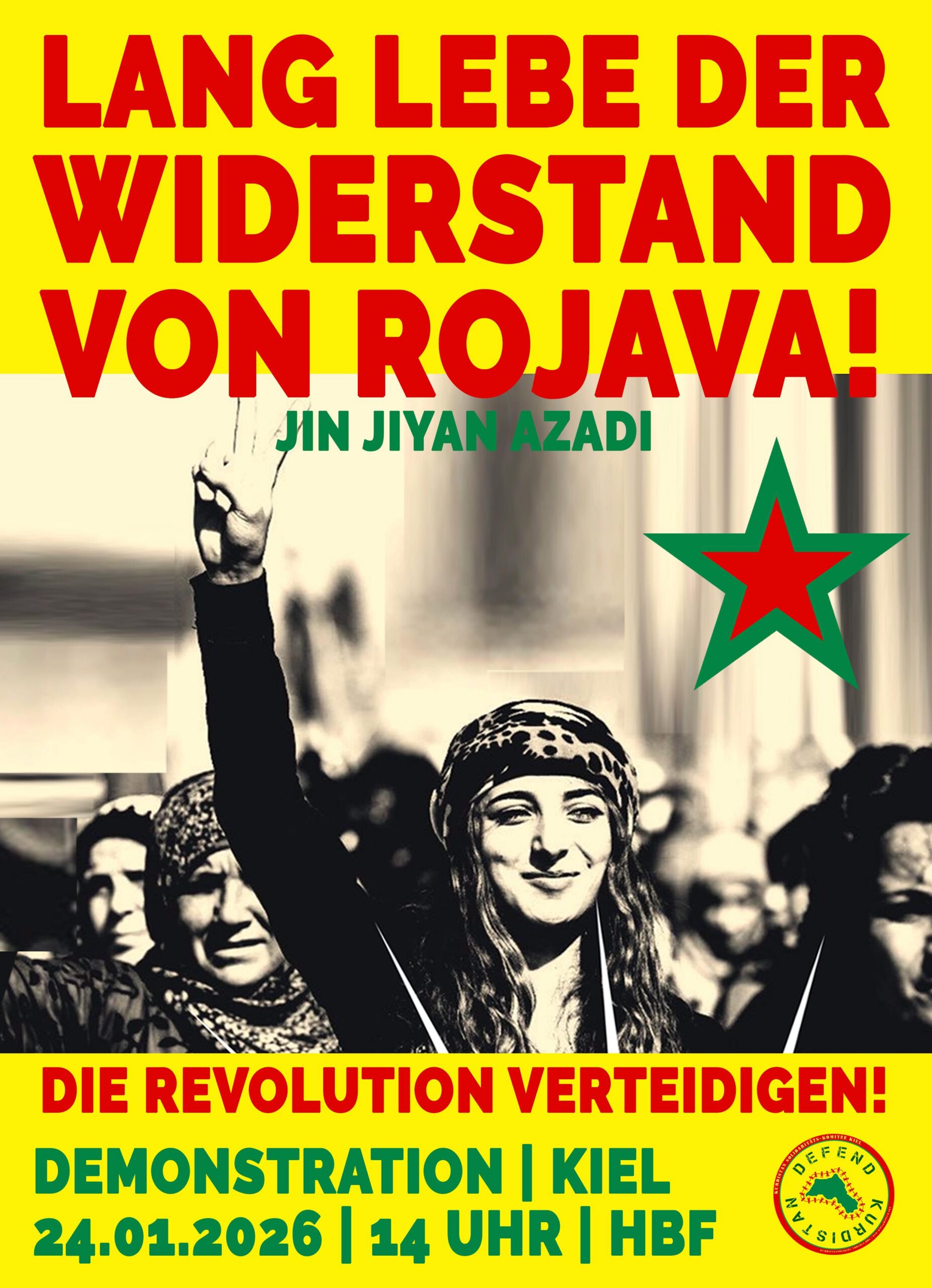 Weltweit drängen dieser Tage die Massen auf die Straßen, um den Verteidiger:innen von Rojava den Rücken zu stärken und die Angreifer zu warnen: Ihr kommt nicht durch, der Widerstand von Rojava wird euer Grab sein. So auch in Kiel, so auch am Samstag. Wir erwarten euch alle auf unserer Demonstration.