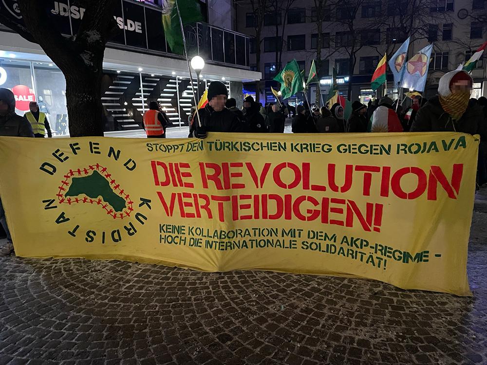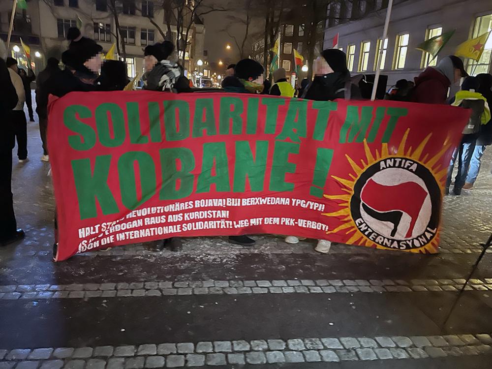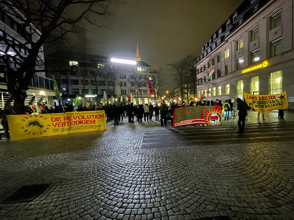 Der spürbare Rückgang der Beteiligung in Relation zu den starken Mobilisierungen der letzten Wochen ist insofern nicht sonderlich überraschend, als dass die akute Bedrohungslage Rojavas sich in Folge des Waffestillstandsabkommens zwischen SDF und dschihdistischer syrischer Übergagsregierung mittlerweile tendenziell abgeschwächt hat und die Waffen weitestgehend schweigen. Nichtsdestotrotz bleiben internationale Solidarität und öffentlicher Druck unabdingbar: Die Autonomie der selbstverwalteten Gebiete sowie die Frauenrevolution stehen weiter unter massivem Druck der reaktionären Mächte, die sich auf die Entmachtung der Demokratischen Selbstverwaltung Nordostsyriens geeinigt haben. Und auch die Stadt Kobanê leidet weiterhin unter dem andauernden Belagerungszustand, die Versorgungslage bleibt katastrophal.